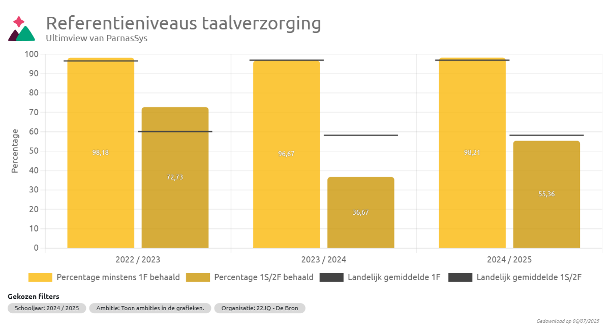 We zijn tevreden met de onderwijskundige resultaten op de hoofdvakgebieden (taalverzorging /rekenen/lezen) die in het afgelopen jaar gemiddeld boven referentieniveaus lagen. De referentieniveaus 1F en 1S/2F liggen gemiddeld boven het landelijk gemiddelde.